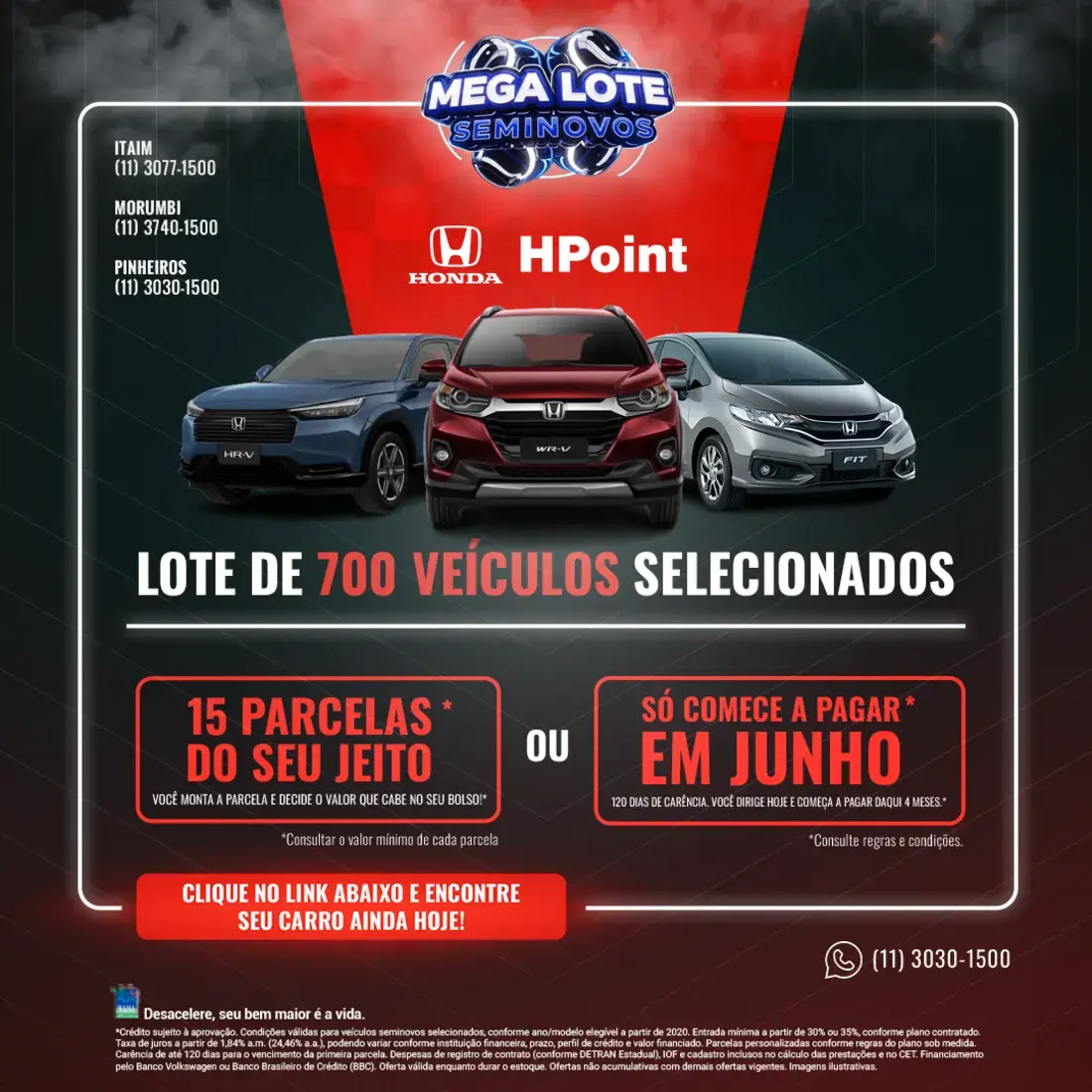 Há mais de 30 anos no mercado a HPoint, possui hoje três concessionárias em pontos nobres da Cidade de São Paulo: Pinheiros, Morumbi e Itaim Bibi, comercializando toda a linha de veículos Honda Nacional e Importados, além de acessórios, peças e serviços. Aqui você se surpreenderá com os veículos e atendimento da Honda. Esperamos por você.